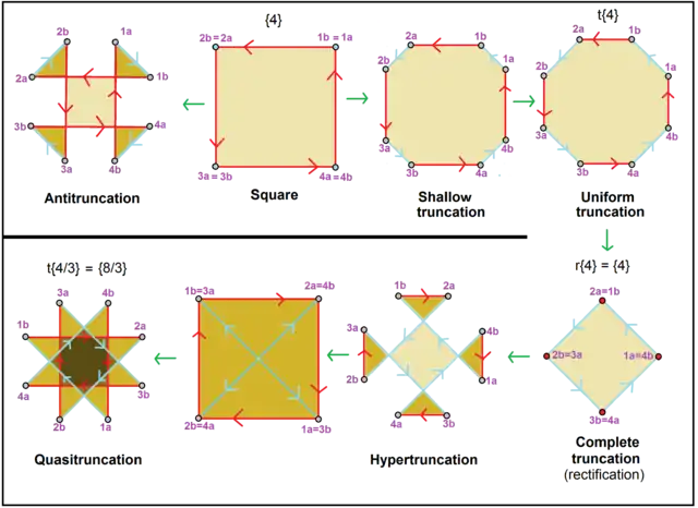 ![]() Типы усечения квадрата, {4}. Исходные рёбра показаны красным цветом, а новые рёбра, полученные в результате усечения — голубым. Однородное усечение является правильным восьмиугольником, t{4}={8}. Полное усечение квадрата становится опять квадратом с диагональной ориентацией сторон. Вершины пронумерованы против часовой стрелки цифрами от 1 до 4, полученные в результате усечения пары отмечены буквами a и b. |