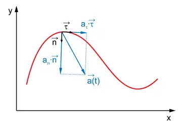 Тангенциальное или касательное ускорение (обозначается иногда и т. д., в зависимости от того, какой буквой в конкретном тексте принято обозначать ускорение) направлено по касательной к траектории. Является составляющей вектора ускорения коллинеарной вектору мгновенной скорости. Характеризует изменение скорости по модулю.