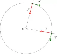 Центростремительное или нормальное ускорение (также обозначается иногда и т. д.) возникает (не равно нулю) всегда при движении точки не только по окружности, но и по любой траектории с ненулевой кривизной. Является составляющей вектора ускорения перпендикулярной вектору мгновенной скорости. Характеризует изменение скорости по направлению. Вектор нормального ускорения всегда направлен к мгновенной оси вращения,