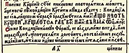Древняя церковь такой формулы не знала. Более того, 72 правилом Карфагенского собора такое крещение совершать запрещено, согласно этому правилу младенцев о крещении которых точно неизвестно: «подобает без всякого сомнения крестити их»[2]. Однако в латинском Требнике «Rituale Romanum» 1617 года эта оговорка уже включена[3]. Петр Могила в 1646 году, используя «Rituale Romanum» при составлении своего Требника, включил в него формулу условного крещения, назвав его «крещение под кондицией»[4][5].