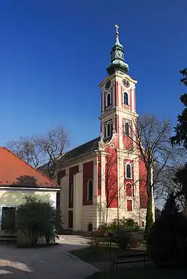 Православная церковь существовала на этом месте ещё до Великого переселения сербов в 1690 году. Об этой церкви известно мало и в октябре 1690 года, когда основная волна сербов прибыла в Сентендре, она, вероятно, уже была разрушена, так как для привезённых в Сентендре мощей Лазаря Хребеляновича пришлось построить небольшую деревянную церковь. Через несколько лет после переселения старая каменная церковь была восстановлена, а недалеко от неё была расположена резиденция патриарха Арсения Черноевича. В 1732—1734 годах епископ Василий (Димитриевич) надстроил над западным фасадом высокую барочную колокольню[1].