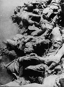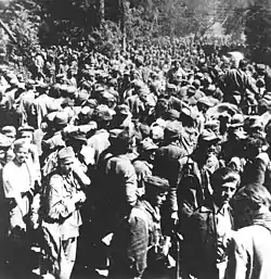 После победы Антифашистской коалиции во Второй мировой войне в мае 1945 г. многие усташи бежали за границу. Непосредственно после окончания войны остатки усташей, части армии НГХ и враждующие с Тито сербские и словенские националистические отряды сдались англичанам на территории современной Австрии, но были выданы обратно югославским коммунистам, которые расстреляли большинство из них. Массовая казнь усташей в австрийском г. Блайбург получила в истории название Блайбургская бойня[86][87]. Число убитых усташей и гражданских хорватов и босняков (включая женщин и детей) оценивается от 15 000 до 100 000 человек[88][89][90][91]. Также было убито до 17 000 словенских домобранцев и сербских четников с членами их семей[92].