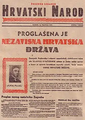 29 марта 1941 года состоялась первая встреча Муссолини и Анте Павелича, которого лидер Италии принял в своей личной резиденции — вилле Торлония[35]. Согласно воспоминаниям исполняющего обязанности министра иностранных дел Филиппо Альфусо, также присутствовавшего при встрече, Муссолини прежде всего беспокоили гарантии в отношении прав Италии на Далмацию, о чем Павелич подтвердил свои прежние заверения; Муссолини также согласился освободить всех соратников Павелича, находящихся в заключении на Липарских островах и где-либо еще; кроме того, Муссолини предоставил в распоряжение Павелича радиостанцию во Флоренции для вещания в вечерние часы[36]. В Италии все собравшиеся усташи во главе с Павеличем в 6 часов вечера 10 апреля услышали по радио провозглашении Независимого Государства Хорватии (хорв. Nezavisna Država Hrvatska), зачитанное в Загребе Славко Кватерником[37][38][39], который заявил о себе как о заместителе поглавника[40]. Это произошло в день ввода передовых частей немецких войск в Загреб. Ожидая прибытия Павелича, Кватерник из своих приближённых сформировал временное правительство — Хорватское государственное руководство, поставив во главе него Миле Будака. Власть на местах либо занимали сторонники усташей, либо о лояльности НГХ заявляли чиновники прежней бановины Хорватия[40]. Окончательное решение по вопросу о том, кто должен возглавить прогерманское правительство Хорватии, было принято в Берлине[39]. Уже с конца марта 1941 года в Загребе находились официальные представители германского правительства и разведки, к которым 3 апреля присоединился штандартенфюрер СС Эдмунд Веезенмайер, представлявший ведомство Риббентропа (нем. Die Dienststelle Ribbentrop)[41]. Веезенмайер явился ключевой фигурой, подготовившей провозглашение НГХ[42]. Первоначально, германское руководство склонялось к тому, чтобы во главе Хорватии был Владко Мачек, который после смерти Радича возглавил Хорватскую крестьянскую партию, имел поддержку большинства хорватского населения и в начале апреля уже занимал пост первого заместителя председателя югославского правительства генерала Симовича; кроме того, в отличие от Павелича, Мачек не был агентом Италии[43]. Лишь только после отказа Мачека, немцы поддержали кандидатуру Италии — Павелича[44]. После провозглашения НГХ, зачитанного Кватерником 10 апреля, по радио было зачитано обращение Мачека, в котором он призывал всех последователей своей партии, а также представителей власти на местах, «оставаться на своих постах и лояльно сотрудничать с новым правительством»[45][46].