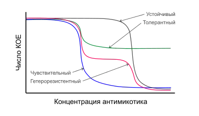 При тестировании изолятов микромицетов на чувствительность in vitro можно наблюдать несколько необычных явлений. Противогрибковая толерантность является характеристикой чувствительных к лекарствам штаммов, которые обладают способностью медленно расти при ингибирующих концентрациях лекарственного средства; обычно только некоторые из клеток данной популяции демонстрируют этот медленный рост[6]. То же самое, что и следовой рост (англ. trailing growth)[41]. Гетерорезистентность — клинический термин для изолятов, содержащих небольшие субпопуляции клеток (обычно <1 %), которые обладают способностью расти при концентрациях лекарственного средства, по крайней мере в восемь раз превышающих МПК для подавляющего большинства чувствительных клеток в популяции. Парадоксальный рост — способность грибкового изолята восстанавливать рост в присутствии высоких концентраций лекарственного средства, но быть полностью чувствительным при более низких концентрациях. Парадоксальный рост появляется с задержкой от одного до нескольких дней, но напоминает рост при отсутствии препарата. Сообщалось о парадоксальном росте в первую очередь в присутствии эхинокандинов. По состоянию на 2020 год, клиническая значимость и молекулярные механизмы данных явлений оставались малоизученными[6].