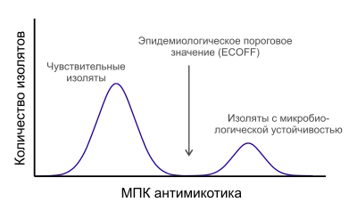 Если геном гриба содержит мутации, обусловливающие снижение эффективности антимикотика, говорят о его микробиологической устойчивости. Под эпидемиологическим пороговым значением (англ. epidemiological cut-off value, ECOFF) понимается такая концентрация антимикотика, которая позволяет отделить штаммы дикого типа от мутантных штаммов. Клиническая устойчивость — это способность грибка выживать и размножаться под действием терапевтических доз антимикотиков, что in vivo выражается в неэффективности противогрибковой терапии[4].