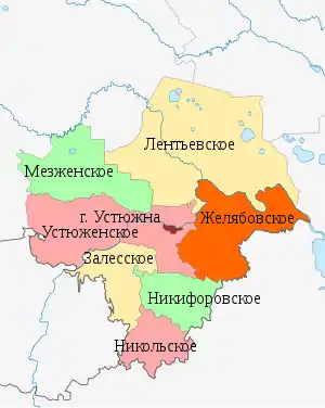 Устюженский район в рамках административно-территориального устройства, включает 15 административно-территориальных единиц: 1 город районного значения (Устюжна), 13 сельсоветов и 1 поссовет (имени Желябова, бывший до 2000 года[16] посёлком городского типа)[17][18]: