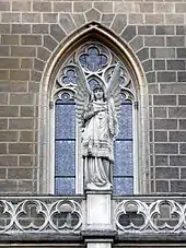 Главный вход в верхний этаж начинается с притвора, над которым возвышается восьмиугольная в плане башенка с пирамидальной крышей. В архитектуре притвора на фоне преобладающей готики в нижней части единичным явлением смотрятся романские окна с многолапостными арками. Во всём остальном здесь гармонично использованы многочисленные атрибуты готической архитектуры: гаргульи, аркбутаны, контрфорсы с пинаклями и тому подобное[2].