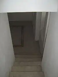 Пол верхнего помещения выложен известняковыми плитами, которые когда-то покрывал ковер. Ковровая дорожка лежала на ступенях лестницы, ведущей в крипту[6].