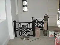 Плоский белый потолок, высотой 2,5 м. имел падугу. Окна украшала решетка в виде двух вертикальных прутьев и большого кольца, связывающего две диагональные цепи.