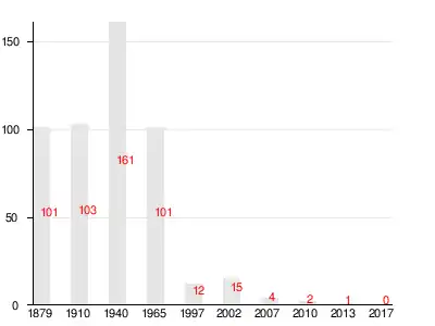 Число жителей по семейным спискам 1879 г.: 42 м. п., 59 ж. п.; по приходским сведениям 1879 г.: 38 м. п., 52 ж. п.[3]