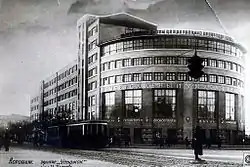 Проекты предложили архитекторы А. И. Попов-Шаман и Н. В. Троицкий. В результате конкурса победу одержал Попов-Шаман, который и выполнил окончательный проект в 1929—1930 годах. Угловая часть решена в виде мощного полуцилиндра радиусом 18 м. Из-за множества окон и узких импостов между ними фасад имел ярко выраженное горизонтальное членение стен, лишённых каких-либо декоративных элементов. Только стены первого этажа частично облицевали груб колотым камнем. Со стороны проспекта Революции здание имело башню с узкими вертикальными окнами. Несмотря на сверхиндустриальный вид строения, все работы при строительстве выполнялись вручную, и к тому же, ударными темпами. Котлован был вырыт всего за две недели, а строительство было завершено к 1934 году.