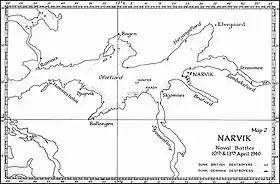 ![]() Карта фьорда и его ответвлений, так же на ней изображены места затопленных кораблей в Битве при Нарвике | |