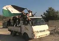 | Грузовик перевозит отряд боевиков «Свободной сирийской армии» (август 2012) | Повстанец ССА, вооруженный ручным пулеметом (Алеппо, октябрь 2012) | Боевики «Свободной сирийской армии» чистят свои АК-47 (Алеппо, октябрь 2012) |