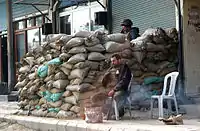 | Правительственные войска патрулируют городские улицы (Дума, январь 2012). | Полицейские патрулируют столичные улицы (Дамаск, январь 2012). | Солдат правительственной армии дежурит на контрольно-пропускном пункте (Дамаск, январь 2012). |