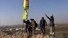 | Флаг Западного Курдистана на блокпосте в Африне (август 2012). | Боевики YPG во время боев за Кобани (окрестности Айн-эль-Араб, январь 2015). | Сторонники «Демократического союза» в городе Африн (август 2012). |