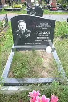 Николай Никитович Ушаков (14 сентября 1924, Петровск, Саратовская губерния — 28 июня 2002, Санкт-Петербург) — старший разведчик 313-го гвардейского артиллерийского полка гвардии ефрейтор — на момент последнего представления к награждению орденом Славы 1-й степени.