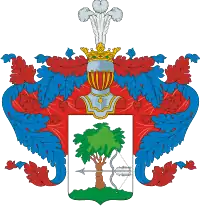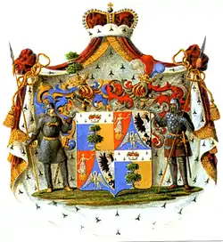 Над щитом два дворянских коронованных шлема. Нашлемники: правого шлема — дуб натурального цвета, пронзенный горизонтально двумя серебряными стрелами влево; левого — три страусовых пера, из коих среднее — червленое, правое — серебряное; левое — лазоревое. Наметы: правого шлема — лазоревый с золотом, левого — червленый с серебром. Щитодержатели: два воина, оба держат по копью. Герб украшен княжеской короной и окружен княжеской мантией с золотыми шнурами и кистями.
