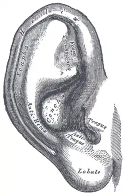 Различные аномалии ушных раковин: ушные привески, бугорок Дарвина, ухо макаки, кошачье ухо, ухо Вильдермута, ухо сатира, отематома, микротия, расщепление ушной мочки.[3]