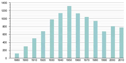 Население города по возрастному диапазону распределилось следующим образом: 20,6 % — жители младше 18 лет, 3,2 % — между 18 и 21 годами, 58,2 % — от 21 до 65 лет и 18,0 % — в возрасте 65 лет и старше. Средний возраст населения — 45,3 года. На каждые 100 женщин приходилось 91,6 мужчин, при этом на 100 совершеннолетних женщин приходилось уже 88,4 мужчин сопоставимого возраста[2].