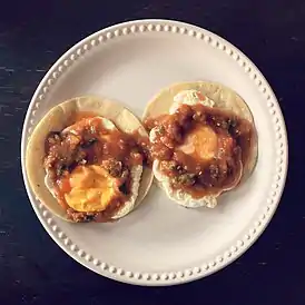 Уэвос ранчерос (исп. Huevos rancheros, «яйца в стиле ранчо») – мексиканское блюдо из жареных яиц на тортилье со свежим соусом из томатов и острого перца. Считается, что его традиционно подавали на завтрак на мексиканских фермах [1][2].