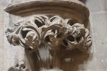 В нижнем ярусе щипца располагаются девять ангелов, из которых Кокерелл опознаёт Михаила, Гавриила, Рафаила и Уриила[103]. В следующем ярусе 12 апостолов, из которых опознаются Иоанн, Андрей и Варфоломей[104]. В самых верхних нишах располагался Христос-судия, одесную его Иоанн Креститель, ошую — Дева Мария, но эти статуи сильно пострадали от иконоборцев[104]. Христа изваяли заново, а боковые ниши заняты херувимами. Христа и Марию изображают ныне обезглавленные фигуры в центральном портале (сюжет «Коронование Богоматери»), также повреждённые Мария и Христос-дитя занимают четырёхлистник в тимпане над дверью[105].
