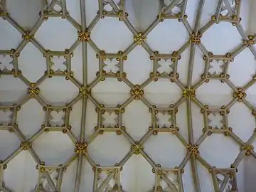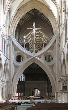 В поперечном сечении собор имеет обычное для крупной церкви строение: центральный и два боковых нефа соединены аркадой, которая образует первый ярус вертикального членения главного нефа. Над аркадой вторым ярусом располагается трифорий, третий ярус — окна под сводами[84]. Высота нефа составляет лишь 67 футов (20 м), что очень мало по сравнению с французскими готическими соборами[85]. Сильным акцентом на горизонталь является уникальный трифорий из совершенно одинаковых пролётов, не создающих обычного деления на секции. Также трифорий отделяется от нижней аркады непрерывной тягой, и вообще на стенах нет ни одной непрерывной вертикальной линии, потому что колонки, поддерживающие свод, начинаются выше трифория[84].
