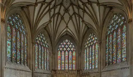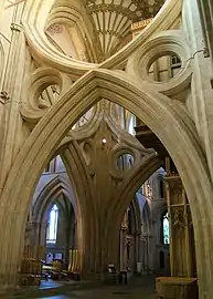 Крипта и капитулярная зала выстроены неизвестными архитекторами в 1275—1310 годах, в раннеанглийском и геометрическом изводе декоративного стиля соответственно. Около 1310 года начата работа над капеллой Девы Марии по проекту Томаса Уитни, который также возвёл в 1315—1322 годах центральную башню, всё в декоративном стиле. Позднее башня изнутри укреплена «ножницами» Уильямом Джоем. Также Джой в 1329—45 годах расширял и переделывал хоры, соединив их с капеллой Девы ретрохором в криволинейном изводе декоративного стиля[32].