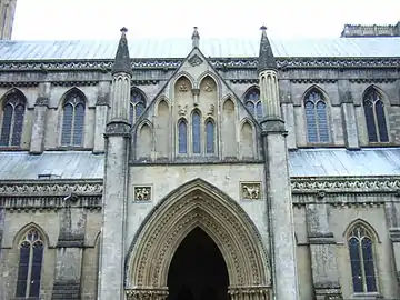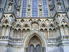 В нижнем ряду ниш располагались стоящие в полный рост скульптуры, из которых по фасаду уцелело лишь 4, по две с каждой стороны. Несколько больше сохранилось на северной и восточной сторонах северной башни. Кокерелл считает, что на южной стороне от портала скульптуры представляли ветхозаветных пророков и патриархов, на северной — первых в Британии миссионеров, из которых по атрибутам удаётся опознать Августина Кентерберийского, святого Бирина и Бенедикта Епископа[97]. Во втором ярусе над каждой парой статуй располагается четырёхлистник с полуростовой фигурой ангела, часть из них сохранилась[98]. Между вимпергами над нишами располагаются четырёхлистники с библейскими сюжетами, ветхозаветными справа, над пророками и патриархами, и новозаветными слева[99]. Над ними фасад разделяется тягой.