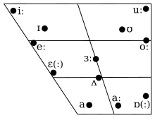 - Стандартному [æ] (cat) соответствует ненапряжённый гласный переднего ряда нижнего подъёма [æ̈][2] Напротив, для Кардиффа характерен переход в [aː][3]. В Поуисе иногда встречается произношение, более распространённое в новозеландском и южноафриканском английском: trap произносится как [trɛp][4].