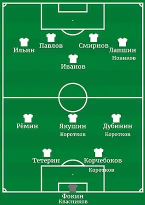 | «Динамо» Москва: Квасников - Коротков, Тетерин - Дубинин, Якушин, Рёмин - Новиков, Лапшин, Иванов, Павлов, Ильин Казанка: Разумовский - И.Андреев |