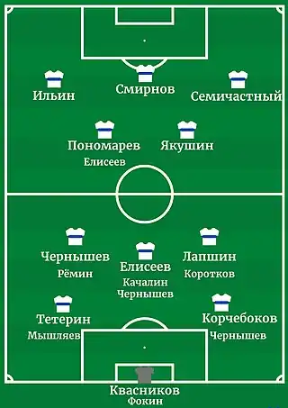 | «Динамо» Москва: Квасников - Тетерин, Корчебоков - Коротков, Елисеев, Ремин - Семичастный, Белоусов, Якушин, Пономарёв, Ильин |