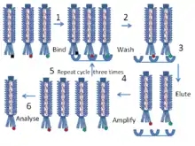 - Связавшиеся фаги могут быть элюированы (отмыты) и использованы для получения новых фагов путём заражения подходящих бактерий-носителей. Новая популяция фагов представляет собой смесь, в которой намного меньше нерелевантных (не связывающихся с целевыми молекулами) фагов, чем в изначальной смеси.