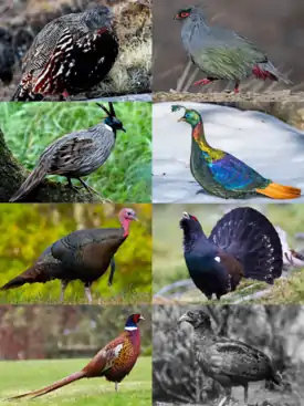 ![]() 1-й ряд: снежная куропатка (Lerwini), итагин (Ithaginini); | ||||||||||