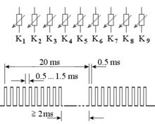 Одним из способов осуществления фазово-импульсной модуляции сигнала является задержка (или упреждение) появления импульса по отношению к началу периода на время, соответствующее значению информационных символов (модулируемого сигнала)[1][2] . При этом импульсы имеют постоянную длительность. Как и в случае широтно-импульсной модуляции, частота следования импульсов ФИМ-сигнала является постоянной величиной.