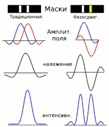 При экспонировании близкорасположенных линий на фотошаблоне световые лучи имеют сходные фазы. Из-за этого на облученных участках в области между линиями наблюдается интерференция хвостов световых потоков, что приводит к снижению разрешения при работе в близком к дифракционному пределу режиме. Если обеспечить экспонирование соседних линий лучами с противоположными фазами за счет использования фазосдвигающих масок, то качество получаемого изображения можно улучшить. Сдвиг фазы обеспечивается покрытием части щелей таких фотошаблонов специальным веществом, сдвигающим фазу лучей на 90 градусов.