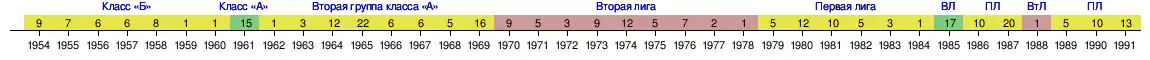 | 1965 | Вторая группа Класса «А» | 22 из 32 | 46 | 12 | 22 | 12 | 41-38 | 46 | 1/32 | |||