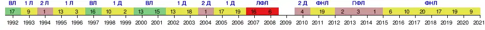| 2018/19 | 17 из 20 | 38 | 9 | 14 | 15 | 36-40 | 41 | 1/32 | Зона вылета | ||||