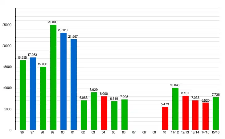 | 1999 | 42 | 26 | 7 | 9 | 65-31 | 85 | 1/8 | ||||||