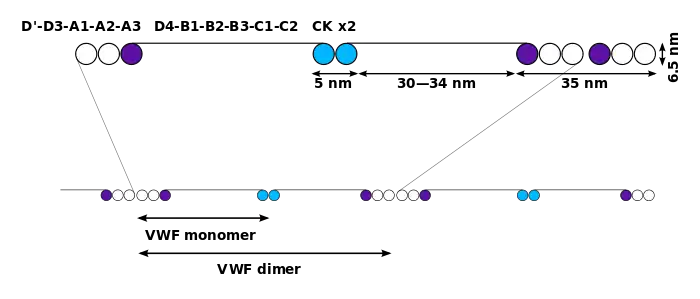 Мономер VWF представляет собой белок, состоящий из 2050 аминокислотных остатков. Каждый мономер содержит ряд доменов, выполняющих специфические функции; среди них стоит особо выделить: