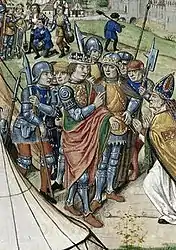 Солдаты с различными секирами, включая фошар и глефу. Миниатюра рукописи «Больших французских хроник», 1487 г.