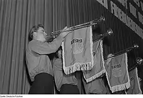 ![]() Фанфаристы с флагами Союза свободной немецкой молодёжи на фанфарах | |