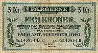 Когда Германия оккупировала Данию 9 апреля 1940 года, датская крона использовалась на Фарерах в качестве валюты. Однако все торговые отношения между Фарерами и Данией были прекращены в результате оккупации, оставив действовать одну валюту на двух независимых друг от друга рынках. 31 мая 1940 были введены специальные фарерские банкноты. Они представляли собой датские банкноты со специальным штампом. Эти банкноты заменили датские 1 к 1.[1]