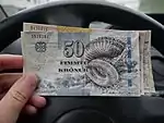С 12 апреля 1949 года фарерская крона была отделена от фунта стерлингов и была прикреплена к датской кроне по равному курсу.[6] Это соглашение по-прежнему в силе. Хотя фарерские банкноты выпускались «от имени Национального банка Дании», Национальный банк Дании не предъявляет никаких прав на фарерские банкноты, выпущенные до 1951.[7]