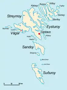 Архипелаг Фарерских островов состоит из 18 островов, 17 из которых обитаемы. Основные острова: Стреймой, Эстурой, Судурой, Воар, Сандой, Бордой. Крупнейший остров — Стреймой (373,5 км²). Общая площадь всех островов — 1395,74 км².