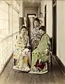 Three prostitues posing on an engawa in Yokohama, ок. 1885. Фотография, раскрашенная вручную.
