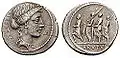Римский денарий 54 года до н.э. Древнеримская богиня Свободы/Консул Луций Юний Брут между двумя ликторами.