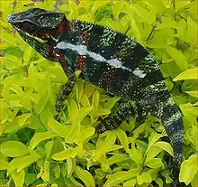 Мадагаскар является оплотом широкого разнообразия эндемичных видов хамелеонов и считается точкой распространения для дневных гекконов. Два рода присутствующих игуан имеют базальное родство с другими игуанами и, как полагают, присутствовали на острове с тех пор, как он отделился от Африки.[14] Мадагаскарская щитоногая черепаха, паучья черепаха, плоскохвостая черепаха, лучистая черепаха и мадагаскарская клювогрудая черепаха находятся под угрозой исчезновения.[13]