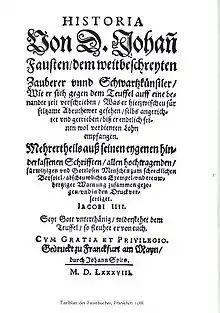- Historia von Dr. Iohann Fausten, dem weitbeschreiten Zauberer und Schwartzkünstler etc. (История о докторе Фаусте, знаменитом волшебнике и чернокнижнике), (1587)