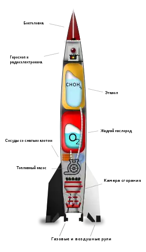 | V-2 (A-4) | «Фау-2» | Жидкий кислород + 75% этиловый спирт | Насосная | 25000 | 65 | 14 | 1,65 | 3000 | 9000 | 1000 | 1500 | 80 | до 300 | Да | Устарелая конструкция. Послужила прототипом многих ракет | ||