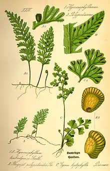 Многолетнее травянистое растение 15—30 см высотой. Корневище тонкое, ползучее, покрыто светло-коричневыми чешуями. Дважды перистораздельные листья от 10 до 50 см длиной, с черешками длиннее листьев. Листовые пластинки треугольные в очертании, нижняя пара сегментов резко отклонены вниз. Сорусы яйцевидно-шаровидные или округлые, без индузия, расположены вдоль края сегментов второго порядка листовой пластинки[4][5], зрелые сорусы чёрного цвета. Споры созревают в июне — августе.